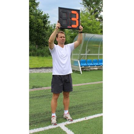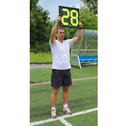 Trénerská pomôcka pri zápase na výmenu hráčov v poli, s reflexnými číslicami pre lepšiu viditeľnosť.