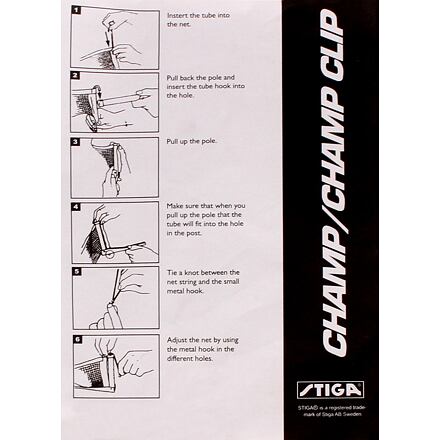 Sieťka na stolný tenis s konštrukciou na uchytenie Stiga Champ je vhodná pre rekreačných hráčov. Vďaka klasickému uťahovaniu na skrutku je jej uchytenie ku klasickým pingpongovým stolom rýchle a jednoduché. Sieťka je vyrobená z modrej nylonovej sieťoviny a konštrukcia je oceľová. Možnosť napnutia sieťky zaisťujú háčiky a bočné otvory v držiakoch. – pre rekreačných hráčov