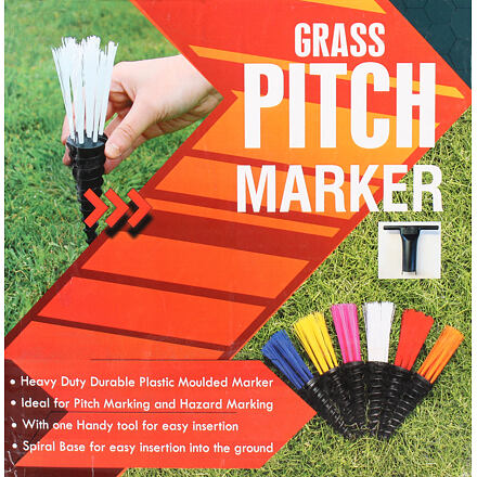 Značkovací systém Pitch Marker je kvalitná pomôcka na vymedzenie tréningovej plochy, na vyznačovanie čiar, veľkého, malého vápna alebo stredového kruhu u trávnatého (futbalového) ihriska a potom zaručuje presné, rýchle načiarovanie. Značkovací systém ponúkame v niekoľkých farbách. Klasicky jednoduchá manipulácia vďaka skrutkovaciej kovovej hlavici, do ktorej zasuniete kolík. Kolík je vyrobený z odolného plastu a pripomína vrták. Otáčavými pohybmi jednoducho upevníte kolík do trávnatej plochy. Vrták má na hornej strane farebné štetinky pre dobrú viditeľnosť. Využitie nájde aj u vyznačení pozemkov (stavieb), parkovacích plôch, trás energetických rozvodov, apod. V balení nájdete 25 kusov vyznačovacích kolíkov a 1 kus skrutkovaciej hlavice. Odporúčame: Akonáhle kolík zarazíte do zeme, nasypte do štetiniek trochu jemného piesku a utlačte, aby sa vlákna štetiniek čo najviac roztvorili a vytvorili tak vejár s priemeome cca 7-8 cm. Parametre:
