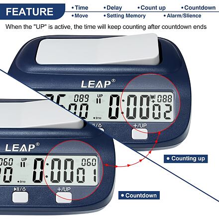 Digitálne šachové hodiny LEAP PQ9923 využijú pri hre ako nadšení amatérski šachisti, tak začínajúci aktívni hráči pri tréningu v šachových oddieloch alebo v školách. Hodiny vyrobené z odolného plastu sa ľahko ovládajú a ich nastavenie je jednoduché a intuitívne. Napriek svojej malej veľkosti ponúkajú dostatočne veľký a prehľadný LCD displej. Napájané sú jednou batériou AA. Funkcie
