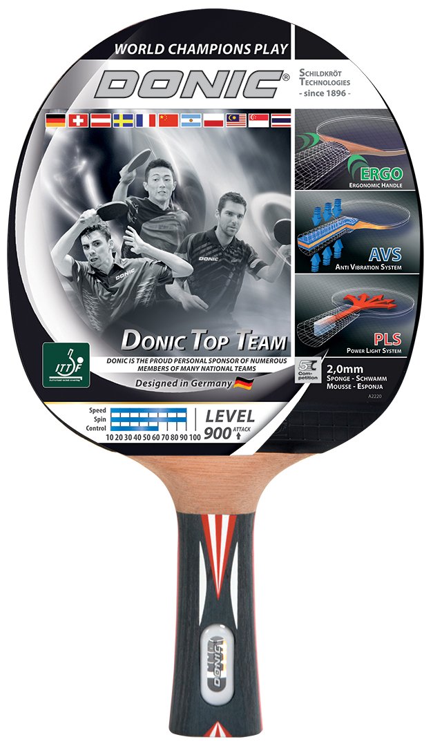 Ping-pongová raketa Donic Schildkröt Top Teams 900Top Team 900 od výrobcu Donic je jedným z top modelov v tejto rade. Model je vybavený radom technológií, ktoré zaisťujú optimálnu zábavu a veľmi efektívne prenášajú vašu hernú techniku na loptičku. Táto raketa so svojimi kvalitnými vlastnosťami bola navrhnutá pre ambicióznych športovcov. Pokiaľ ide o kvalitu dreva a priľnavosti, tento prémiový model je vybavený vysoko kvalitným poťahom Alpha Slick od Schildkröt schválenou ITTF, ktorý generuje extra silu vďaka svojej 2,0 mm hrúbke. Povrch sa tak vyznačuje vynikajúcou priľnavosťou a maximálnou rotáciou a podporuje všetky mysliteľné herné techniky. Takzvaná ERGO rukoväť sa sedí v ruke oveľa lepšie ako klasické rukoväte a vyhýba sa otlakom na ukazováku. Táto technológia zo súťažného športu si teraz nachádza cestu aj do oblasti rekreačných rakiet a umožňuje tak superrýchle prepínanie z forehandu na backhand (a naopak). Vďaka technológii PLS (Power Light System) je raketa, ktorá má dutú rukoväť, ľahšia. Výsledkom je skvelá ovládateľnosť so zlepšenou silou úderu. Tiež vstavaná technológia AVS (Anti Vibration System) medzi čepeľou a rukoväťou znateľne znižuje vibrácie a umožňuje tak menšiu únavu pri hraní. Raketa je určená predovšetkým hráčom, ktorí uprednostňujú útočnú hru.
