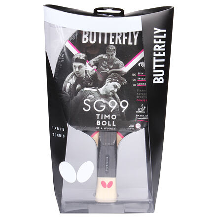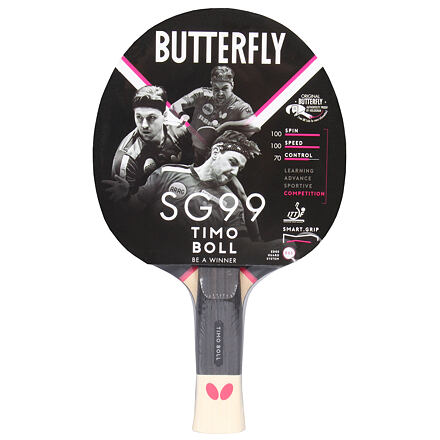 Rad pálok na stolný tenis Timo Boll SG (Smart Grip) z dielne popredného výrobce Butterfly nesie názov po jednom z najlepších hráčov stolného tenisu vôbec. Ping pongová pálka Timo Boll SG99 je dizajnovaná pre top výkonnostných hráčov, ktorí už dosahujú vysoké herné úrovne, zároveň však usilujú o ešte vyššie rozvoj svojich herných zručností až k výnimočným schopnostiam šampióna Bolla a chcú vynikať rovnako ako on ako nadmierou technicky odohraných loptičiek tak aj dynamicky ofenzívnymi smečmi. Vedľa vycibrenej technickej úrovne úderov na spin a pozoruhodné rýchlosti pohybu s bleskovými reflexy pri príjme súperových lôpt budete samozrejme potrebovať aj zodpovedajúce výkonnostné pálku. Model Timo Boll SG99 disponuje 1,8 mm poťahom Wabaka pre vyšší potenciál spinových úderov s anatomicky tvarovaným držadlom so stredovým zárezom pre citlivejšie a plnšie úchop pálky a pre minimalizáciu rizika skĺznutiu prstov. Technologickou vychytávkou pálky je tiež EGS systém (Edge Guard System), upravený okraj poťahu pálky pre redukciu straty energie odpálenej loptičky pri jeho zasiahnutí pri okraji. Timo Boll SG99 je spoľahlivým nástrojom pre vysoké herné tempo a technicky vycibrený herný štýl.